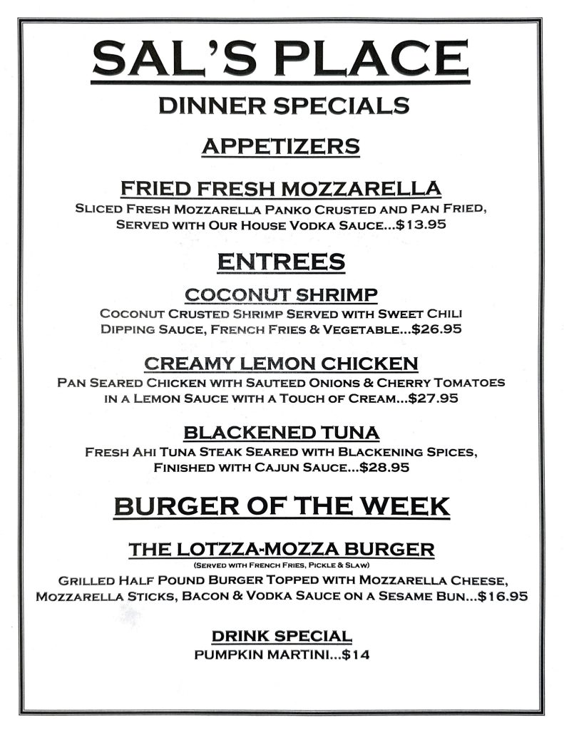Long Island’s most popular neighborhood restaurant, Sal’s Place serves American cuisine in a relaxed and casual setting. We offer a full lunch and dinner menu with daily specials in the dining room and the bar. Behind the bar, an outstanding wine list, local micro-brews and a large selection of hand-crafted specialty cocktails are offered. Private parties, large groups & special events are welcome. We look forward to seeing you soon!